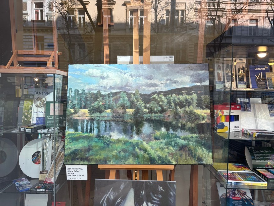 One painting is exhibit in the display window of the Art Suppliers shop at Korunní 926, Prague 2.