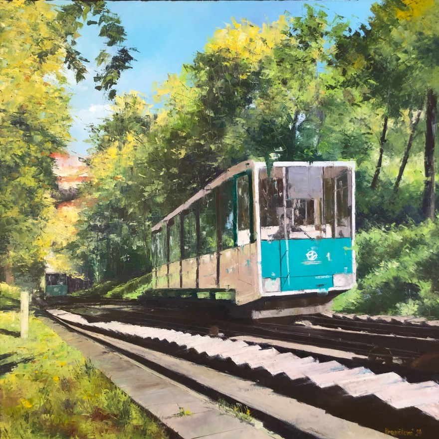 Lanovkou na Petřín/ Funicular to Petřín 2024 (80 x 80 cm)